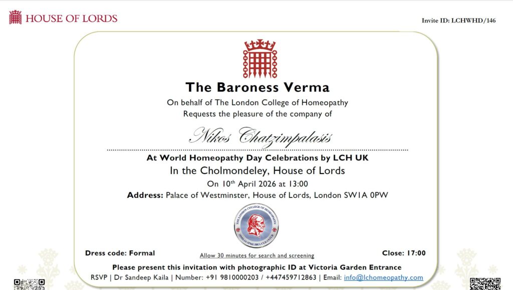 Official invitation to World Homeopathy Day 2026, Cholmondeley Room, House of Lords